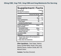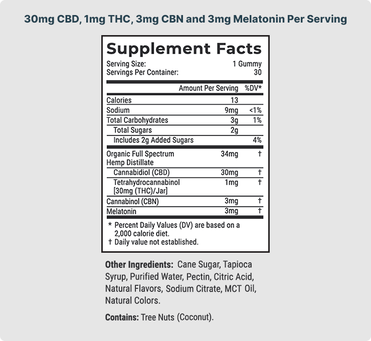 Each gummy contains 30mg of full spectrum CBD, 1mg of Delta 9 THC, and 3mg of melatonin. This blend is designed to support a calming nighttime routine.
